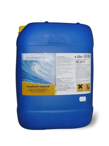 Жидкий препарат Аквабланк изготовлен на основе активного кислорода. Предназначен для дезинфекции и обеззараживания воды в плавательных бассейнах без применения хлора. Препарат также может быть использован, как профилактика против роста водорослей. pH нейтральный, не пенится. В составе: пероксид водорода и четвертичные аммониевые соединения.