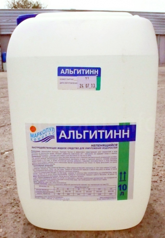 Жидкое средство Альгитинн эффективно предотвращает рост водорослей в воде бассейна на длительное время. При этом не происходит пенообразований, что облегчает обработку бассейна. Обладает эффектом осветления, рН – нейтрален, в составе нет хлора и тяжелых металлов. Альтигинн пригоден для использования в бассейнах любого типа, в том числе SPA. В составе четвертичные соединения аммония.