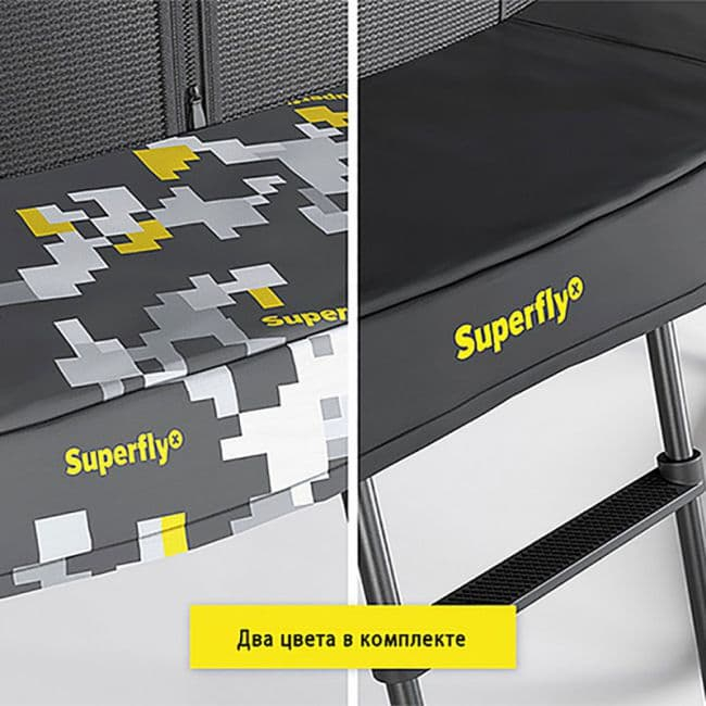 Внешний вид. Серия Superfly имеет двухсторонний защитный мат, то есть вы можете переворачивать мат и менять дизайн батута. В комплекте два цветовых решения: это Digital Como — он же цифровой камуфляж и Black classic или просто классический черный.