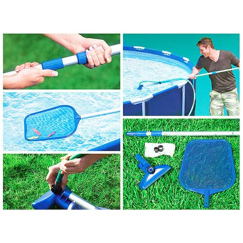 Набор для чистки упрощает уборку вашего бассейна. В комплекте используется сачок для сбора мусора на поверхности воды и специальная насадка-пылесос, которая служит для очистки дна. Насадки крепятся на легкую телескопическую алюминиевую ручку длиной 239 см, обеспечивающую доступ в любую точку бассейна диаметром свыше 457 см. Принцип работы насадки-пылесоса: насадка присоединяется к садовому шлангу, опускается на дно бассейна, где напором воды поднимается осевшая грязь, которая потом поступает в специальный мешочек для сбора мусора. По мере заполнения мешочка грязью, он достается и промывается . Потом  процедура повторяется до полной очистки бассейна. Если Вы купите этот комплект для очистки , то поверхность воды и  дно вашего бассейна всегда будут чистыми.